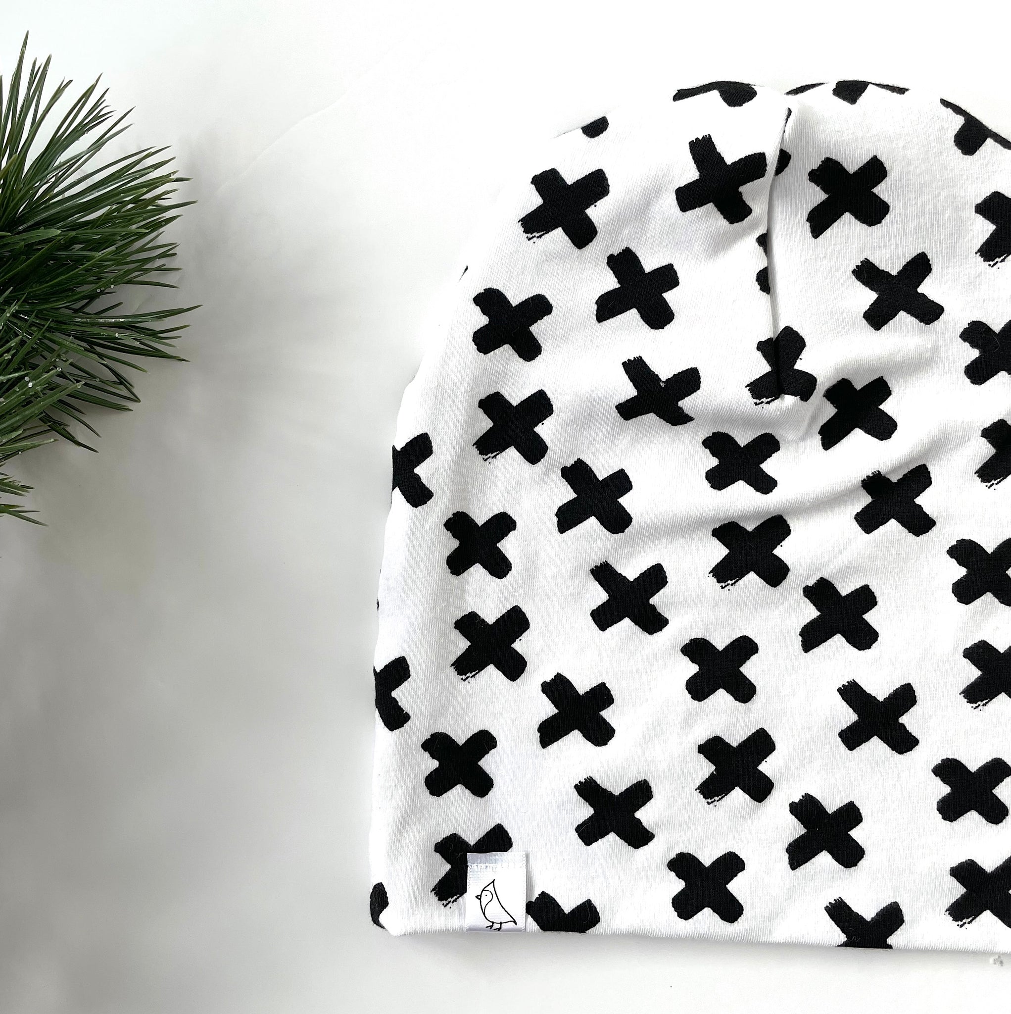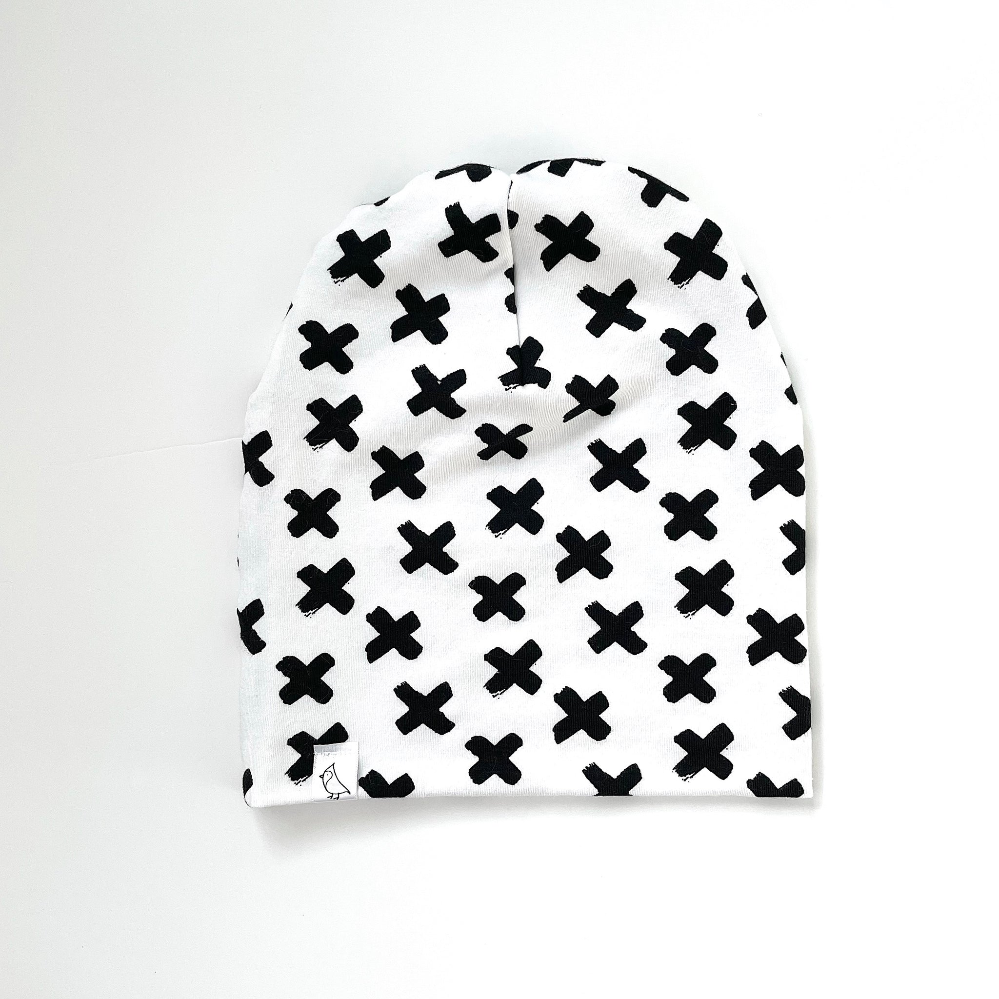 The Black and White X Beanie is made from a soft and stretchy cotton spandex knit that is Oeko Tex 100 approved; free of restricted dyes. All DM beanies are made with hidden side seams and reversible labels so that they can be worn slouchy or with a cuff.