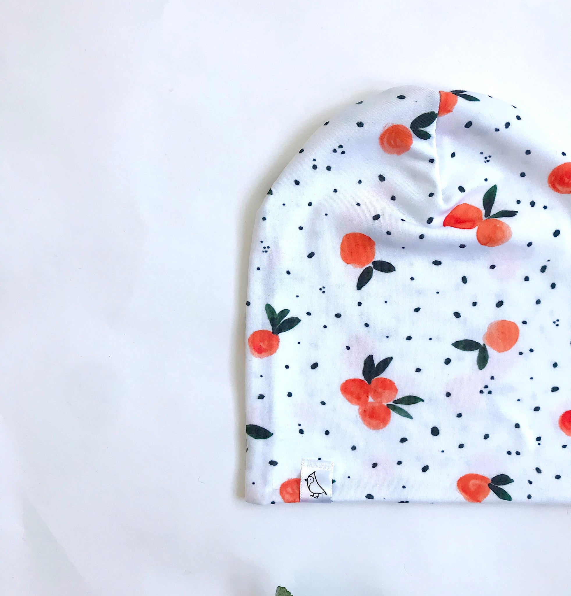 The Clementine Beanie is made from a soft and stretchy cotton spandex knit that is Oeko Tex 100 approved; free of restricted dyes. All DM beanies are made with hidden side seams and reversible labels so that they can be worn slouchy or with a cuff.