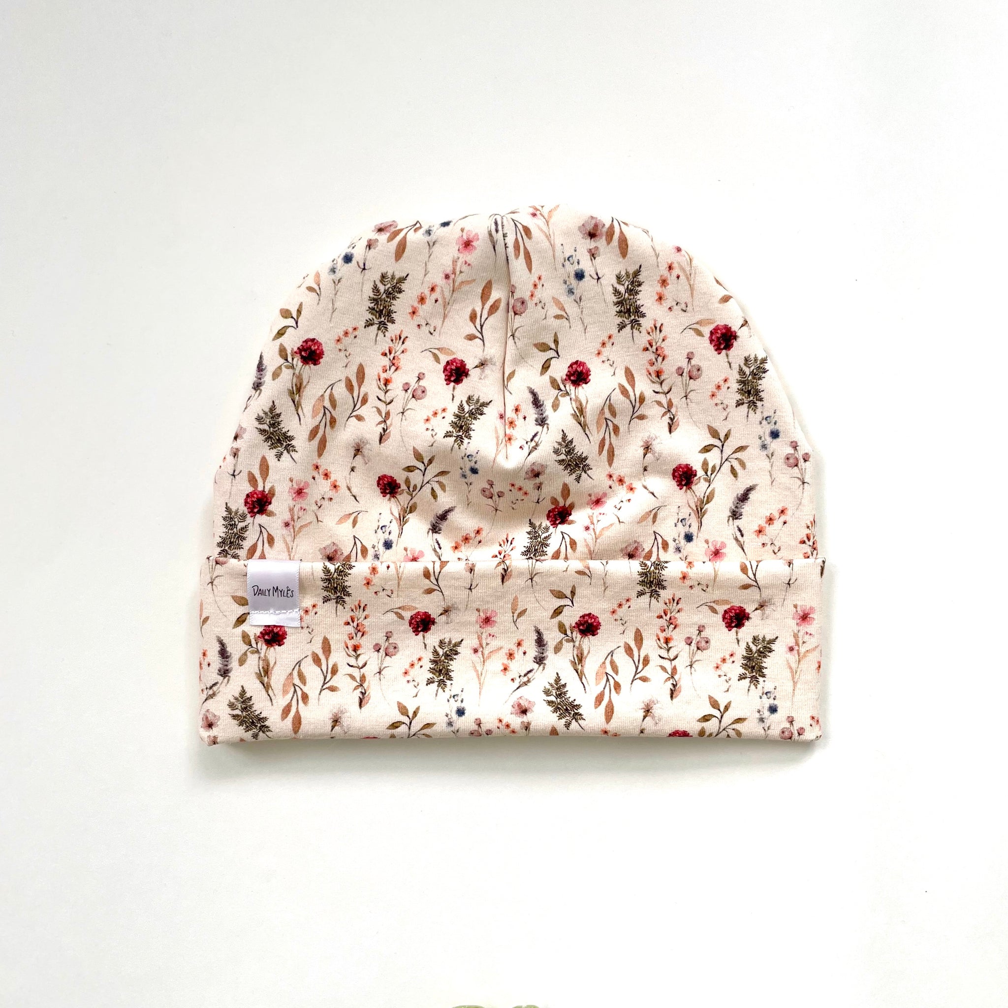The Fairytale Floral Beanie is made from the softest, lightweight and stretchy cotton spandex knit. This fabric is organic and Oeko Tex 100 approved. All DM beanies are made with hidden side seams and reversible labels so that the can be worn slouchy or cuffed!