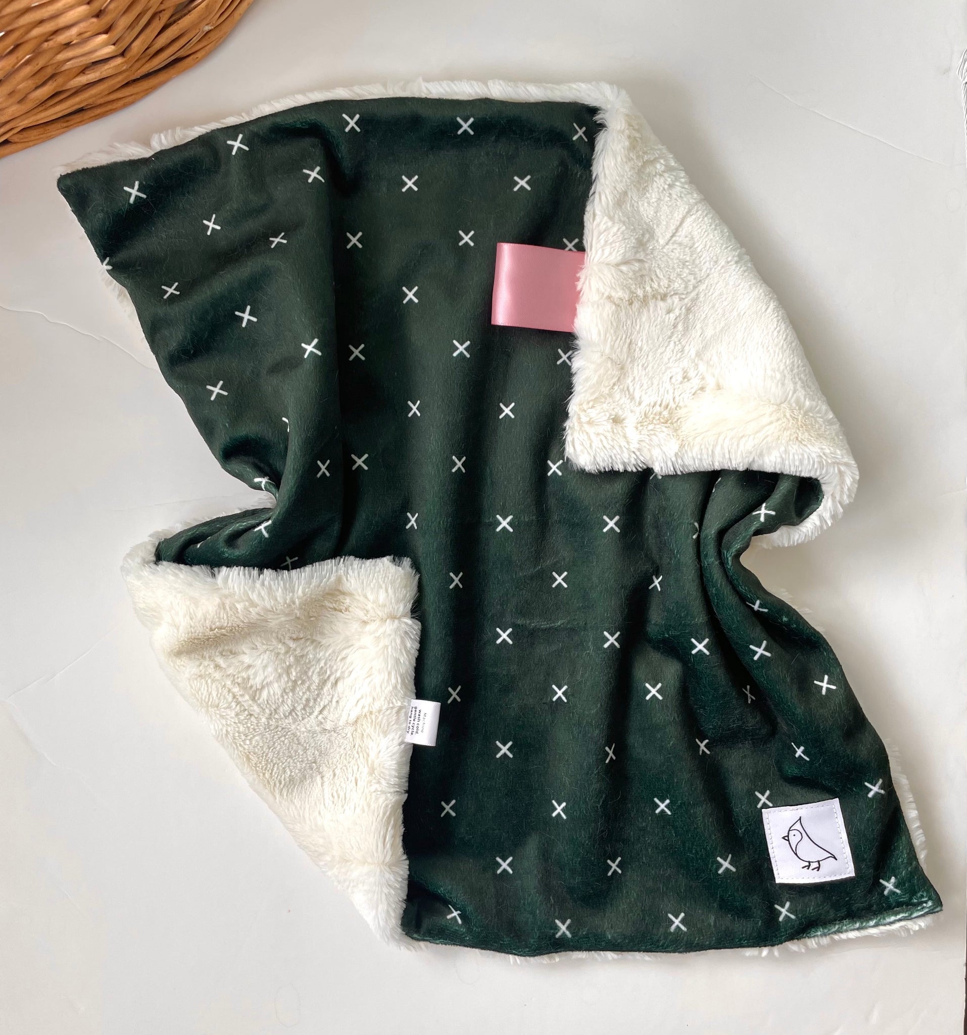 Green blanket with white cross patterns and ivory faux fur minky reverse. A satin dusty pink ribbon is in the upper right corner.