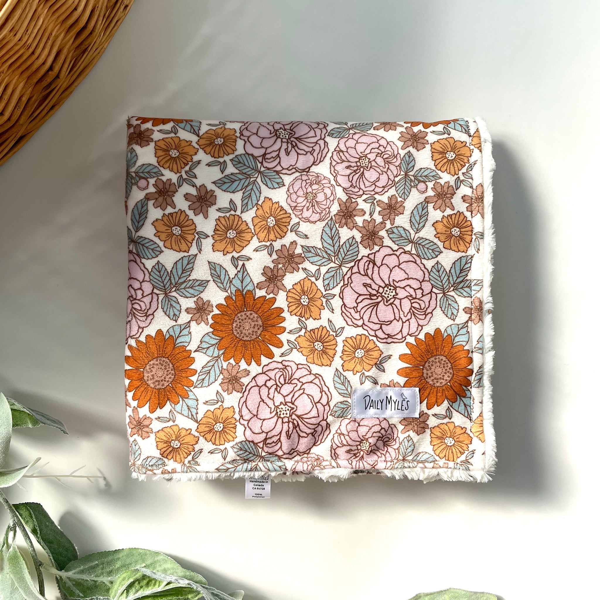 The Golden Girl Floral Cozy Blanket features a beautiful boho floral printed front and an ultra soft faux fur minky backing. Top stitched edges create a professional finish. These blankets are meant to be heirloom pieces that are loved for years and tucked away as a keepsake piece or passed along to another child.