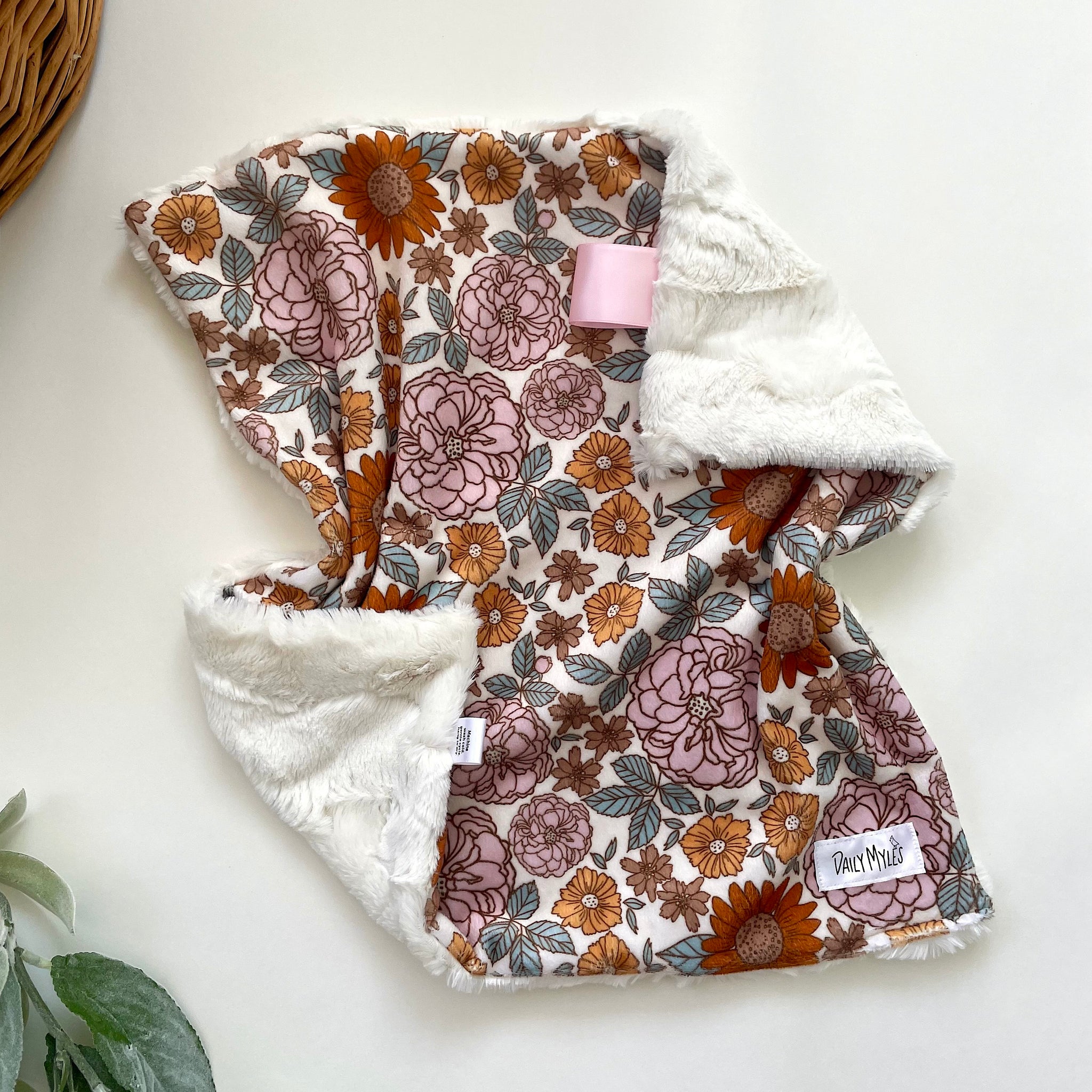 **Pictured is the Golden Girl Floral Lovey with the Ivory Backing and Light Pink Ribbon**