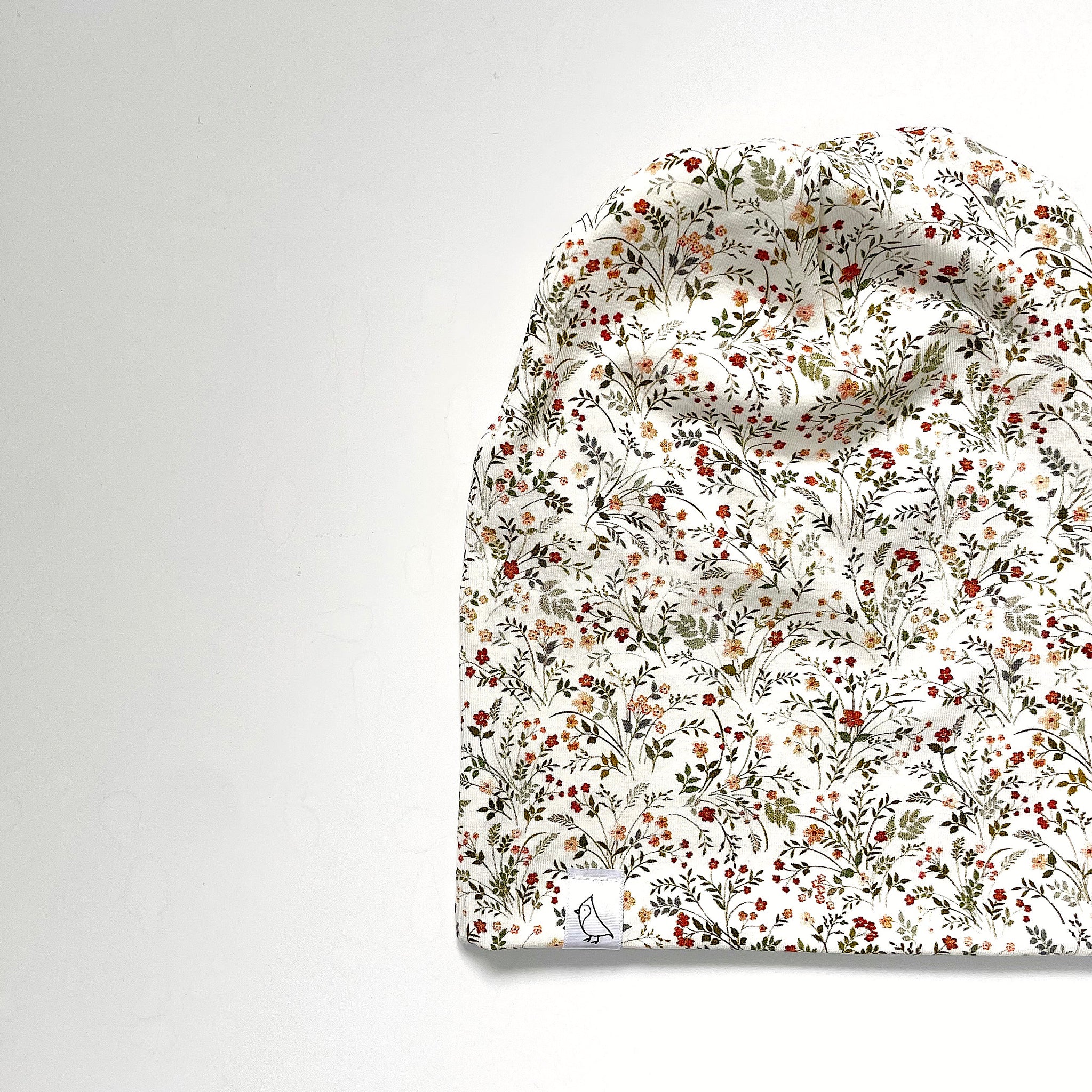 The Meadow Beanie is made from the softest, lightweight and stretchy cotton spandex knit. This fabric is organic and Oeko Tex 100 approved. All DM beanies are made with hidden side seams and reversible labels so that the can be worn slouchy or cuffed!