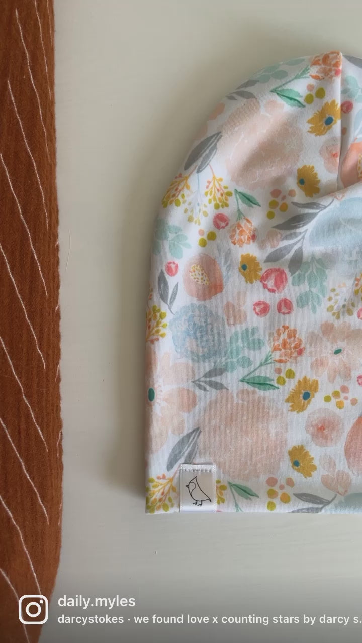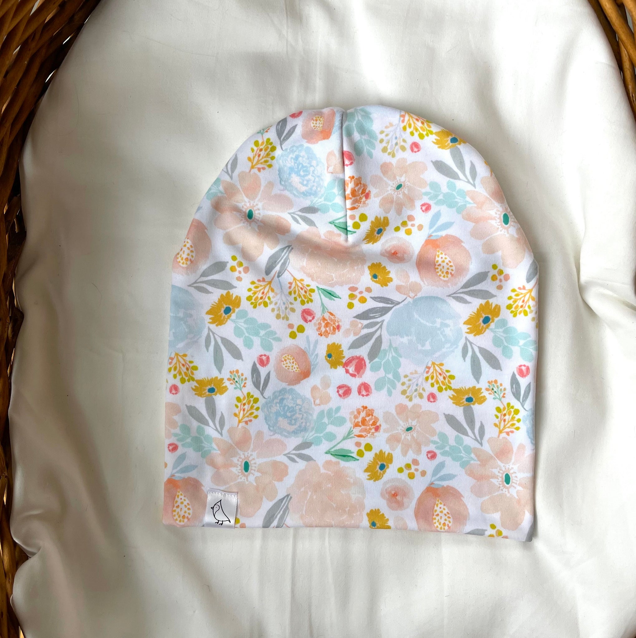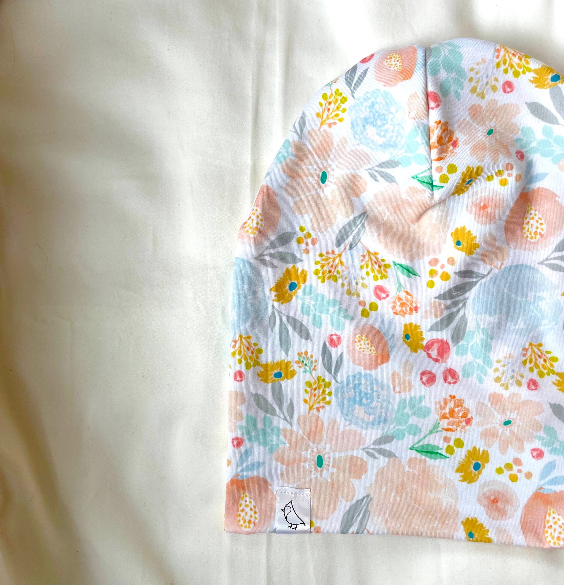 The Pastel Floral Beanie is made from the softest, lightweight and stretchy cotton spandex knit.