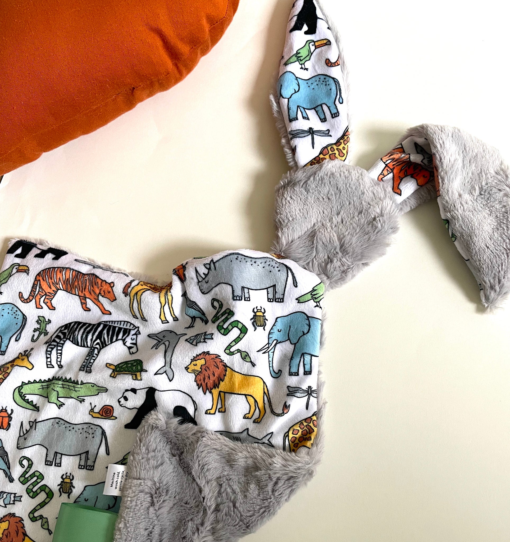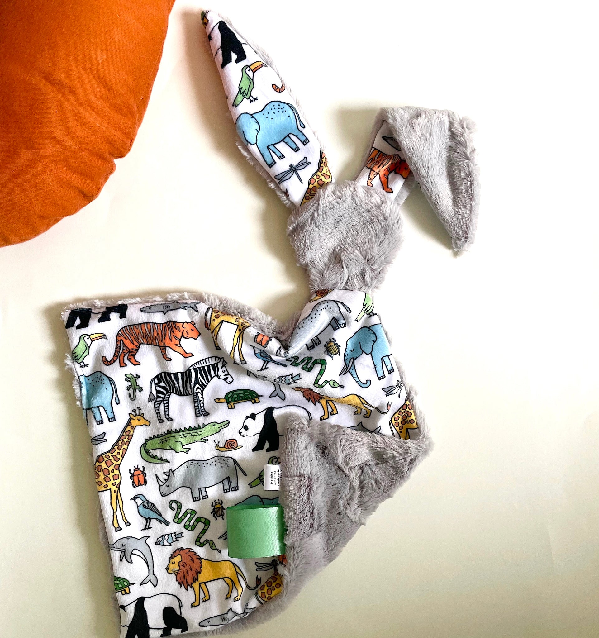 The Bunny Lovey is a fun take on our classic Lovey design. These are a smaller size (the square is approx. 11in x 11in, but the full lovey measures approx. 24in from top of ear to bottom point). They are made with an ultra soft, sustainably printed minky front and a faux fur minky backing and feature a silky soft satin ribbon in the lower right corner. The Bunny style Lovey's are not only a great comfort piece but also a great sensory item for baby and toddler.